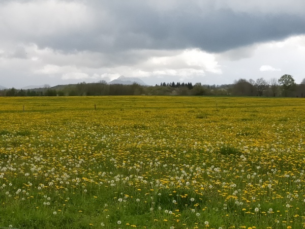 L’après-midi nous offre de beaux paysages champêtres, très verdoyants, et des prés couverts de pissenlits qui semblent s’étendre jusqu’au puy de Dôme au loin.