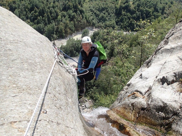 Mardi : Albert et Irène décident d’aller faire une journée découverte culturelle locale : manger une entrecôte-frites et aller au supermarché. Christine, Erik, François, Marc et moi découvrons alors le magnifique canyon de Val Bianca. Christine commence par sortir l’adhésif américain pour redonner jeunesse à ses chaussures défoncées et essayer de battre le record des précédentes chaussures d’hiver d’Albert (12 ans). Christine s’est albertisée : AR, c’est plus qu’un sigle, c’est un état d’esprit. La première partie est faite de successions de toboggans ludiques, de sauts dans des vasques limpides dans un bel encaissement. Puis, changement de thème dans la deuxième partie abrupte, ouverte sur la vallée, enchainant sans discontinuité de grandes verticales et une vasque suspendue. Sur le chemin du retour, la dernière cascade se termine sur un siphon facultatif, ludique ce jour, mais qui doit être compliqué par grand débit. On s’installe en terrasse pour le rituel quotidien d’une glace italienne. Parfum carotte, violette, curcuma et spiruline sont aussi proposés à la carte des glaces de ce petit village perché ; il faudra y revenir avec Irène, adepte du jus de pomme-bergamote bio.
