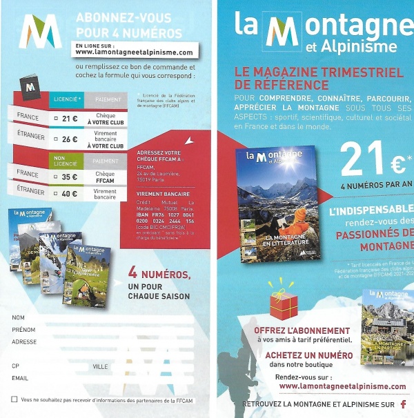 L'abonnement valable 12 mois pour 4 numéros peut être souscrit à n'importe quel moment de l'année au tarif préférentiel de 21 € pour les licenciés Club Alpin. Pour ceux préférant souscrire de façon traditionnelle, des flyers sont disponibles à la permanence du club le jeudi.