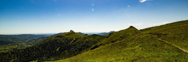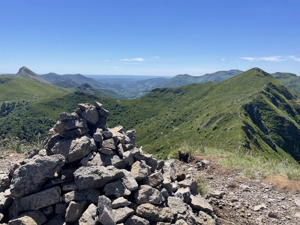Depuis Dienne (1 050 m), Le Marchadial et Drils, nous avons déjà un bel aperçu de notre premier objectif du jour : le puy de Peyre Arse. Nous évoluons dans une vallée verdoyante avant de débuter notre ascension avec de très belles vues, entre autres sur le puy Griou et le puy Mary, puis de rejoindre le chemin des crêtes qui nous permet d’atteindre notre première halte pour déjeuner : le Peyre Arse (1 806 m).
