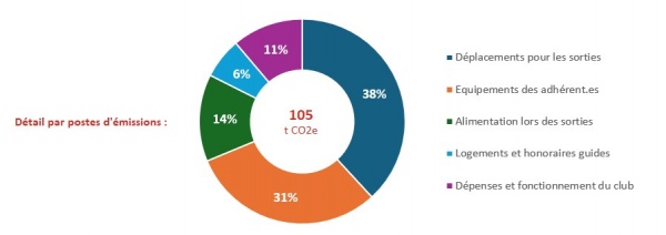 Le graphique fait ressortir les trois postes d’émission principaux, qui sont, dans l’ordre : les déplacements pour les sorties, les achats d’équipement et l’alimentation lors des sorties. Même si de nombreuses actions ont déjà été engagées (généralisation du covoiturage, location de minibus, prêt de matériel, organisation de braderie…), il reste sûrement des axes d’amélioration visant à réduire l’empreinte carbone de notre club.
