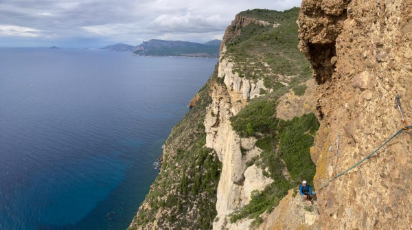 S’en suit une remontée avec de jolis passages en dalle, dans l'ambiance « Calanques » si parti- culière, le blanc éclatant du calcaire contrastant avec les nuances de bleus sous nos pieds, le tout avec une vue imprenable sur l’aiguille de l’Eissadon.