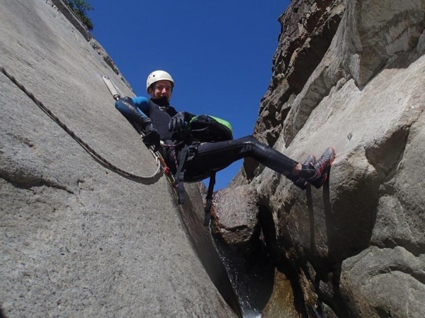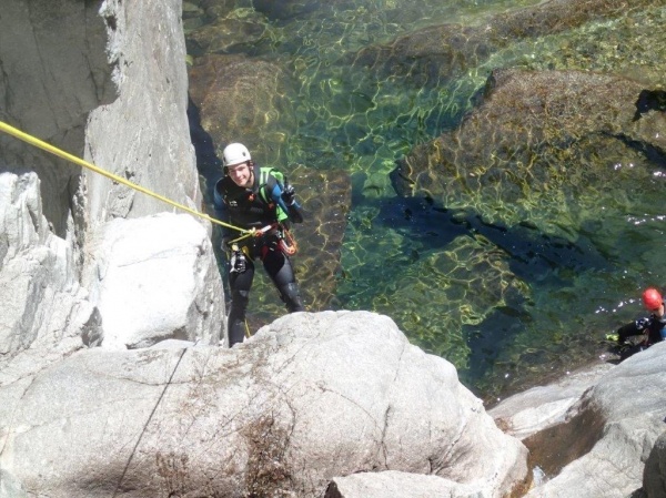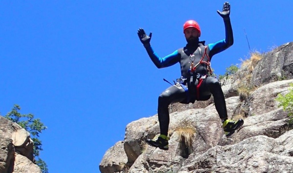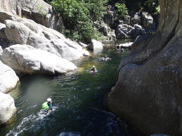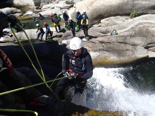 Nous quittons le camp pour le canyon de Fustugère, beaucoup moins arrosé que celui de la veille, mais aussi plus vertical. Nous enchaînons les sauts et les rappels équipés par les encadrants de la sortie.