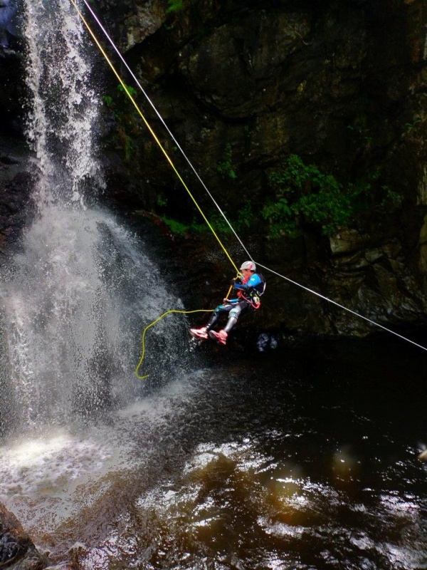 S’ensuit un premier vrai petit rappel glissant avant d’en atteindre un second, équipé et guidé. Ça ressemble un peu à une tyrolienne, et ça nous évite de trop nous faire doucher par la cascade. La troisième et dernière cascade n’est pas si loin mais tous ces rappels ont été entrecoupés de marches, glissades, et sauts évidemment ! Vite suivi par ses copains, un de nos ados nous fait une belle démonstration de sauts périlleux : avant, arrière… Loïc se transforme en chercheur d’épave pour récupérer la corde malencontreusement échouée au fond d’une vasque. Bravo ! Les bénévoles ont aussi eu le temps de tester la température des cascades pour le contre-assurage : merci à eux !