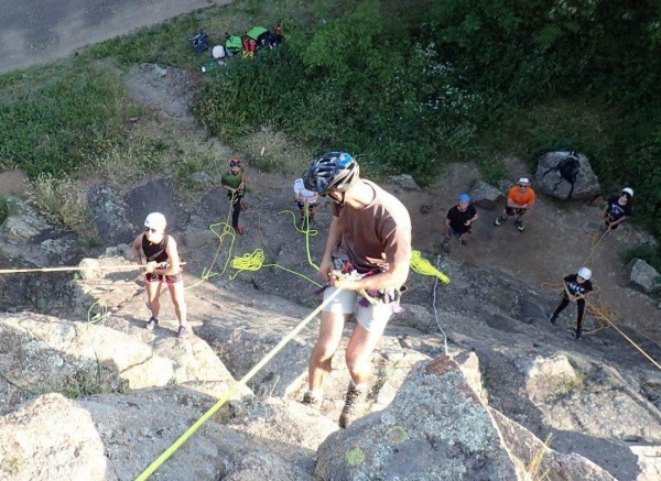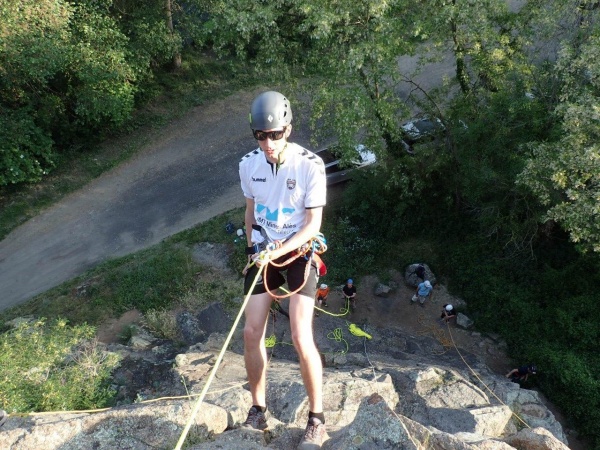 Sous un soleil éclatant, l'eau fraîche de l'Allier nous fait de l'œil, mais pas de mise à l'eau prévue pour aujourd'hui. Nous enfilons casques, chaussures de rando, et direction le site d'escalade des Rochettes.