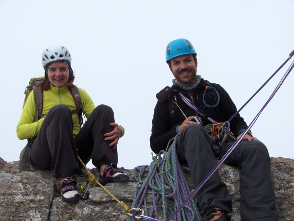 Charlotte, super motivée, part en tête dans la première longueur... bon équipement montagne, un peu aéré cependant, lecture de voie un peu délicate, mais du haut de ses trente ans du jour, la demoiselle est persévérante, félicitations ! Je rejoins Charlotte et nous poursuivons en réversible nos trois longueurs.