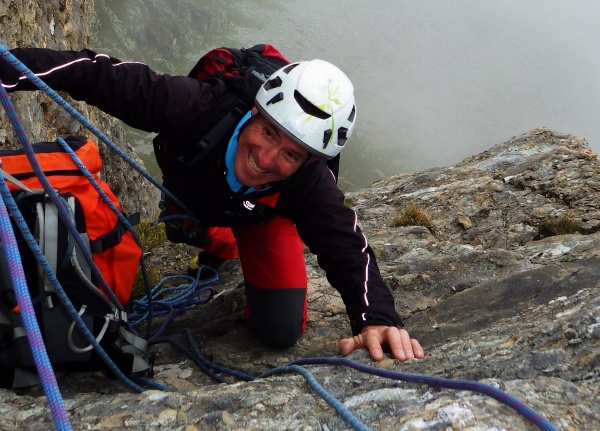 Raïko suit avec Séverine et Bernard en flèche. « Mais que fais-je ici ? » crie Séverine qui reprend l'escalade après presque une année de pause ? « Bernard, redescends moi ! ». Je n'ai sans doute pas entendu... à cause du vent ! Deuxième longueur en traversée, partie la plus délicate de cette voie : un assurage complémentaire en téléphérique pour remotiver Séverine, n'exclut pas pour autant quelques bordées de jurons... ça déstresse et ça passe !