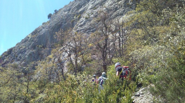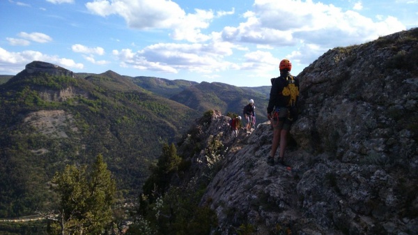 Deuxième jour, tout le monde est sur le pont tôt afin de ne pas perdre trop de temps. Les véhicules sont chargés de l’équipement, et direction le fameux Dièdre sud au départ de la place du village. Une petite marche ascensionnelle d’un kilomètre et demi qui permet, avec des passages en via, de chauffer les muscles. C’est le début de l’ascension des sept longueurs. Une première voie polie, puis un dièdre, font déjà entendre les premiers « sec ! » puis les glissades qui suivent. Mais en tête, point de renoncement, le « c’est génial ! » ou « c’est super ! » ne cessera pas jusqu’au sommet. Quelques nœuds et entortillements de cordes dans les « sangles », pardon les dégaines, viennent ralentir la progression.