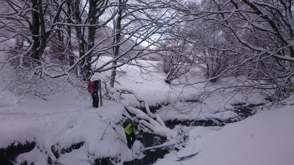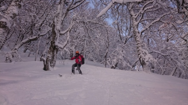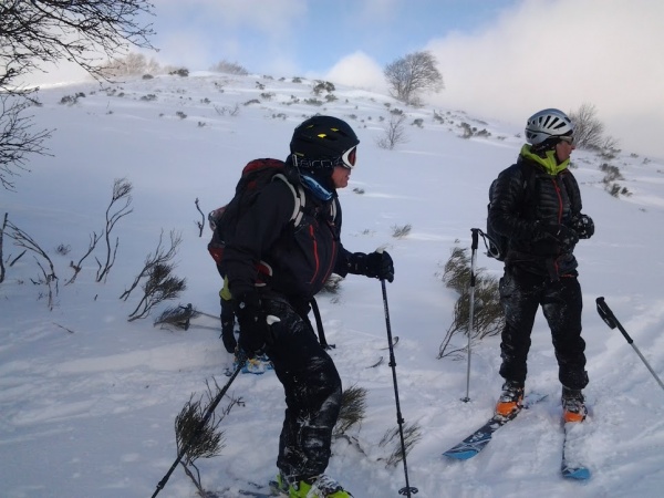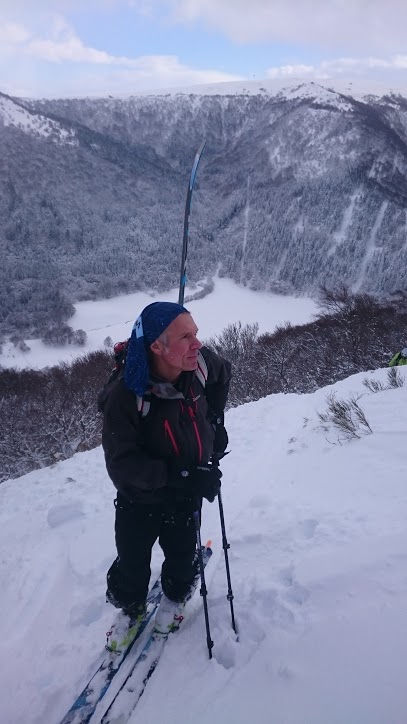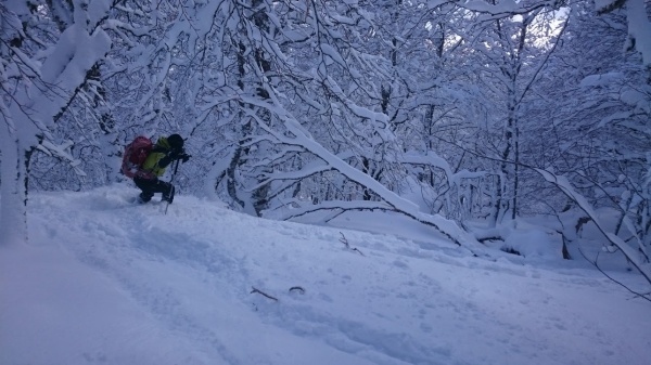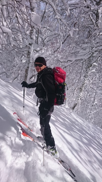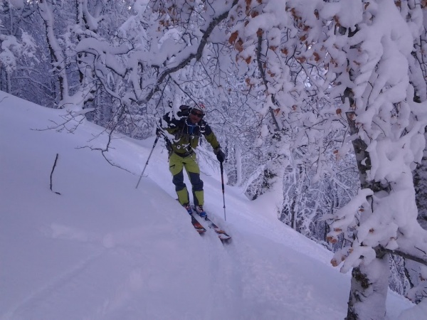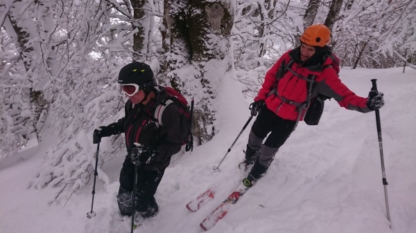Après ce bon refroidissement, c'est reparti pour remonter le bois (le premier...) avec Claire au traçage à travers bois, rochers et divers obstacles. Une fois au sommet, l'appel de la poudre est trop fort, et on replonge d'où on vient. Ce coup-ci, la déco est faite. Il n'y a plus qu'à remonter une dernière fois. Didier, puis DD, sont abandonnés par leurs peaux (de phoques...) et finissent à pied. Belle séance de musculation dans 50 cm de neige et belle démonstration de forme de nos deux plus anciens.