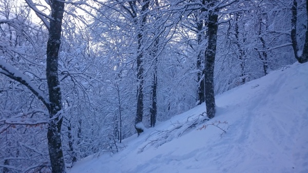 Remontée en face, avec franchissement de ruisseaux, clôtures et autres talus, en direction du plateau. Très belle balade dans la forêt avec paysage de carte postale. Arrivés au sommet (Montagne de la Plate), le vent n'encourageant pas au pique-nique, nous plongeons dans un goulet, puis dans la forêt jusqu'au buron de Chaudefour (fermé) où nous nous installons sous l'auvent pour nous protéger de la neige.
