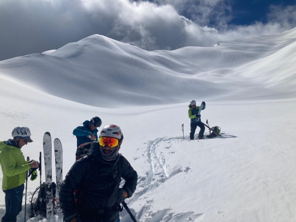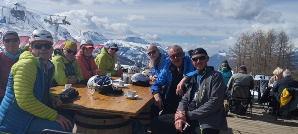 Encore une très belle journée ensoleillée. La neige est variable, des passages en neige lourde et un peu transformée. Pas de trace cette fois, il faut se relayer, mais Biloute a la forme et tire le groupe vers le haut ! Quelques pentes plus marquées avec davantage de conversions. L’épreuve est plus physique et étire doucement l’équipe au rythme de chacun. A la fin, tous au sommet, c’est super !