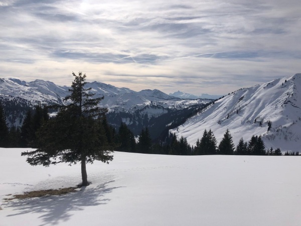 C’est le dernier jour… Départ paisible en station. L’ambiance est printanière ce matin et de belles coulées de neige apparaissent sur quelques faces exposées. Nous sommes prudents. Bordure de piste puis exutoire vers les grands espaces ! Une belle balade sans difficulté pour clore cette magnifique semaine de ski de randonnée.