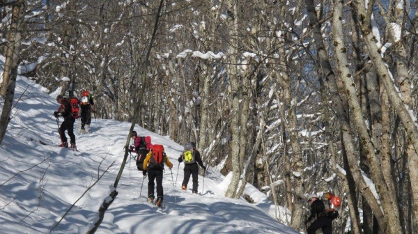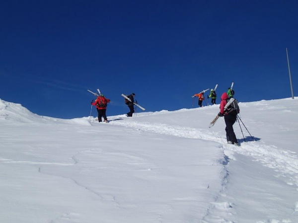 Nuageux et frais. Il a bien neigé la nuit. Nous montons dans une couche de neige fraîche de 30 à 40 cm par un large chemin qui devient étroit et plus pentu, rencontre d'autres chemins et d'autres chemins, nécessitant la sortie de cartes et autres traces GPS. Nous arrivons devant un magnifique triangle au beau profil avalancheux. Nous n'atteindrons pas notre objectif. Descente par la trace de montée dans une neige molle, mouillée et collante. Chaque descendeur laisse la trace au suivant qui glisse mieux. Pas de virages, ça ne glisse pas.