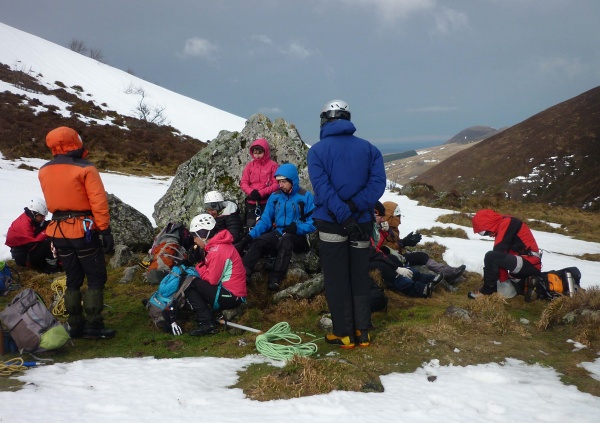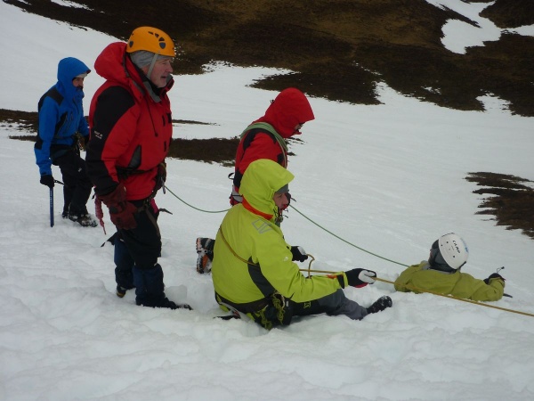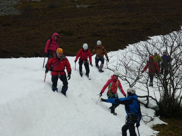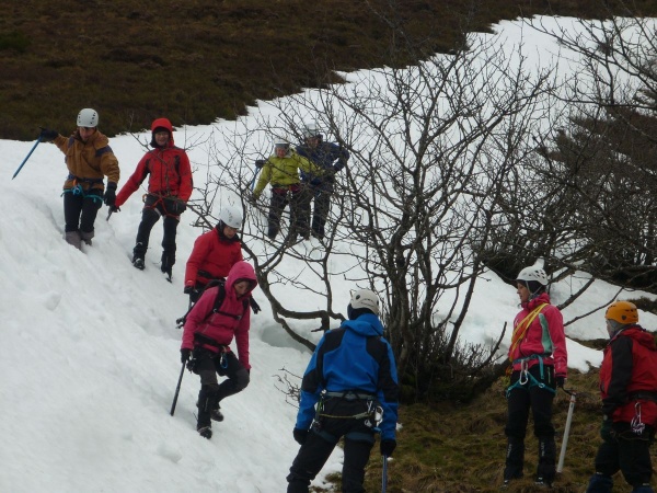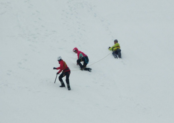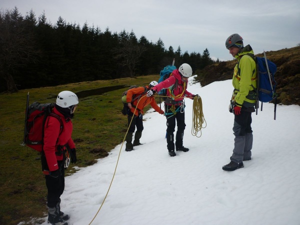 Michel nous propose de voir les encordements, la position du baudrier et comment marcher en cordée. Nous n'aurons pas le plaisir de chausser les crampons, la neige ne s’y prête pas. Trois cordées de trois se forment et nous partons, corde tendue, sur un glacier crevassé imaginaire, sous l'œil vigilant de Michel, Stéphane et Thierry.