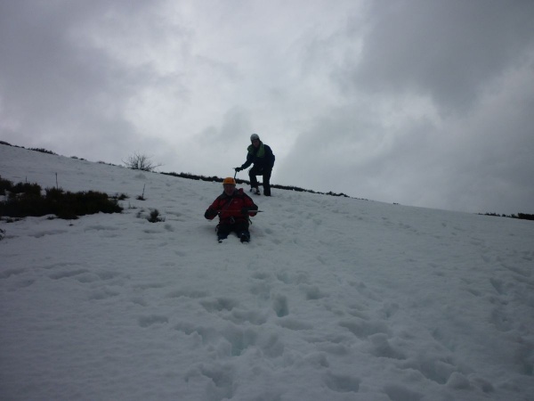 Quelques petites pentes enneigées s’offrent à nous. Michel et Stéphane en profitent pour nous décrire physiquement les différentes techniques de cramponnage en montée et descente, comment utiliser le piolet, ainsi que les anneaux de buste et le lovage de corde. A notre tour d’effectuer des allers et retours.