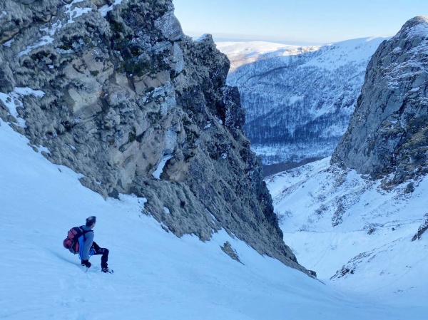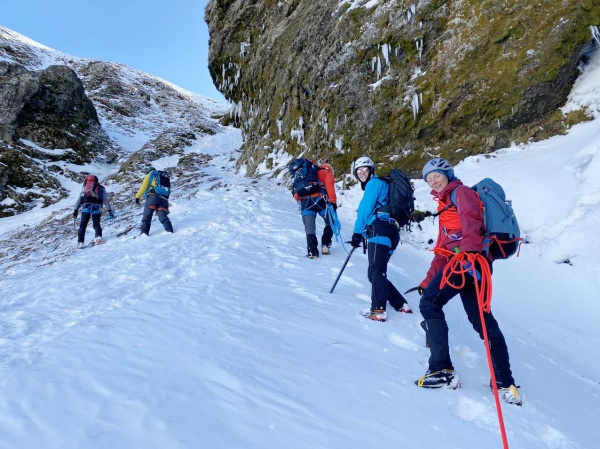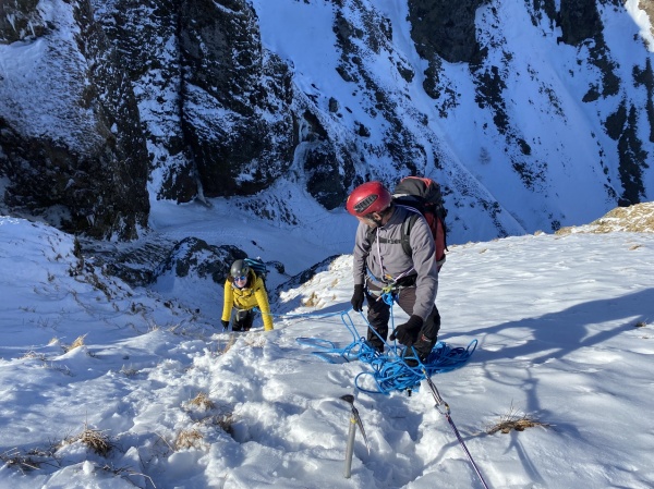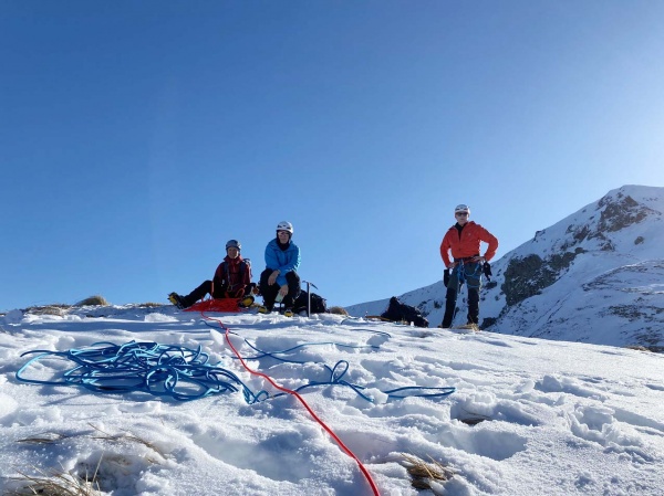 Au gré de notre progression, Noël et Joanna prennent le temps d’expliquer les bonnes pratiques de base : progresser en crampons dans les dévers et les pentes raides, assurer son partenaire de cordée dans un passage délicat, utiliser une ancre à neige, effectuer une recherche DVA, faire un relais avec des broches à glace ou autour d’un rocher, etc. Les exercices se font selon les opportunités du terrain et le souci de sécurité des cordées.
