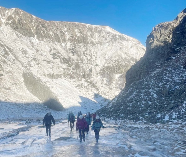 Nous nous élançons par le val de Courre où rapidement la glace nous impose de mettre les crampons, l’occasion de débuter par des exercices techniques de progression, descentes et marche en dévers en crampons dans les couloirs.
