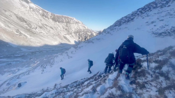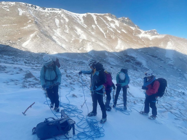 C’est ensuite le moment de former des cordées pour commencer l’ascension du col de Courre, de réviser la progression en crampons et piolet encordés sur pentes raides.