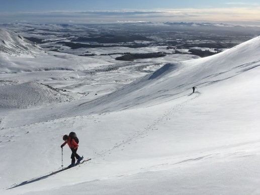 Le temps est au beau presque fixe, une petite couche d’une dizaine de centimètres de neige fraîche adoucit bien le terrain, premières conversions dans les bois, la neige est rare, mais douce. Objectif : le puy Ferrand. La vue est magnifique sur les monts du Cantal et jusqu’au Forez… L’herbe sort un peu partout, mais n’entrave pas nos progressions. Descente courte mais bonne, pour une pause repas bien méritée, au soleil à l’abri du vent… Quelques exercices de recherche mono-victime plus tard, plusieurs groupes votent la montée au puy Gros qui nous nargue avec seulement deux traces…