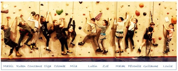Sur la photo de groupe, la promotion 2023 – 2024 de l’école d’escalade avec douze enfants âgés de 7 à 11 ans.