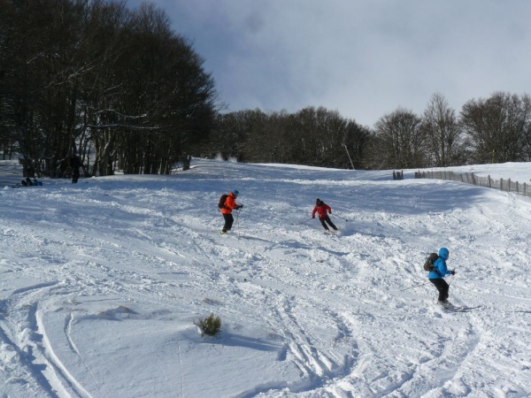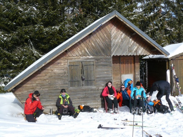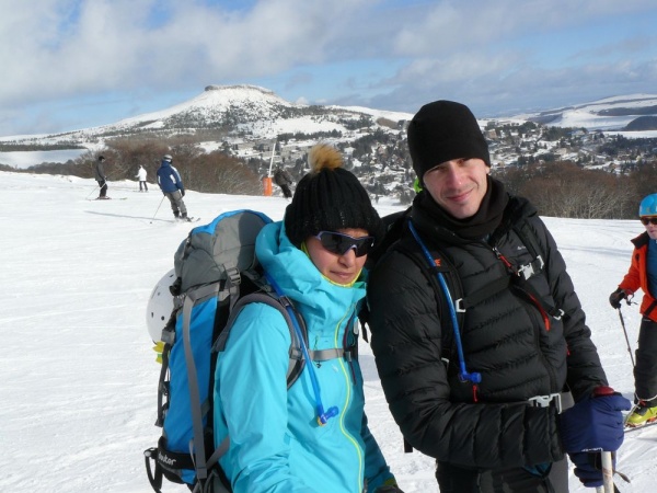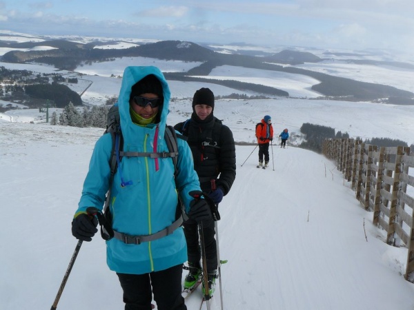 Enfin, la neige est au rendez-vous en ce samedi 14 janvier à Super-Besse, après un long mois d'attente, et ce ne sont pas des rafales de vent à 40 km/h, des averses de neige et une température de - 7 °C qui vont empêcher Pauline, Sabrine, les deux Alexandre, Guillaume et leur deux encadrants d'en profiter ! Après s'être équipés sous une averse en plein vent, début de la montée le long des pistes et, déjà, le soleil fait de belles apparitions. L'heure est venue pour le défi de la conversion ! Tous les styles sont permis. Puis la montée se poursuit dans les bois, pour arriver au site du second défi : retrouver le DVA caché dans la neige. Là aussi, chacun son style : par exemple, Guillaume s'ensevelira involontairement jusqu'à mi-cuisse dans un terrier...Tiens, voilà une bonne cachette introuvable pour le prochain cobaye ! Et le soleil est toujours là, mais la température négative rabat tout le monde au pied des pistes pour un pique-nique contre un petit chalet à l'abri du vent, le soleil pile en face. Parfait !