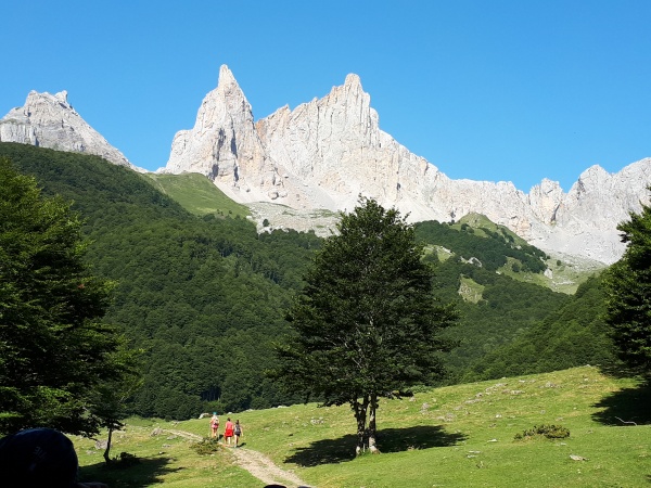 Une belle grimpette pour commencer, le col de Petrachema (2084 m) qui nous fera basculer pour les cinq jours suivants sur le versant espagnol. Le départ se fait sous un soleil radieux, zéro nuages, il fait déjà très chaud dans le petit village de Lescun qui est à seulement 870 m d’altitude. Dans le Béarn, les paysages verdoyants sont magnifiques avec la vue sur le Cirque de Lescun ; le passage du col restera inoubliable, surplombé par les Aiguilles d’Ansabère (2378 m) sur notre droite. Le versant espagnol est beaucoup plus sec et il fait encore plus chaud ; heureusement, nous finirons notre étape en sous-bois avant d’arriver au refuge de Linza (1340 m). Rafraîchissement au bar et farniente, c’est les vacances !