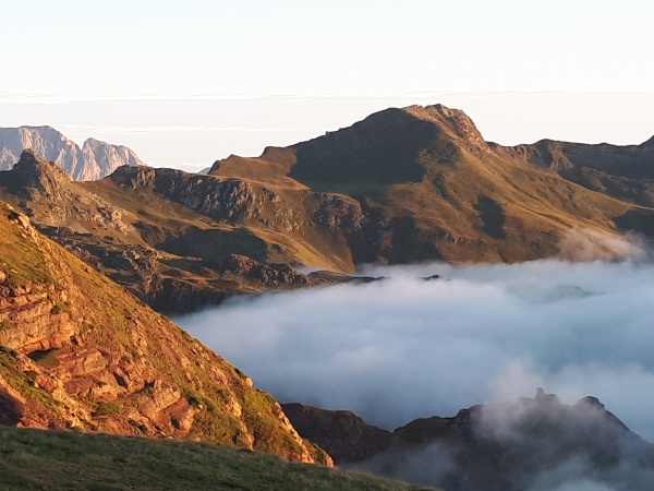 Grâce à un petit orage en début de nuit, le réveil est grandiose ce matin !!! On est au-dessus d’une magnifique mer de nuages qui envahit toutes les vallées et laisse juste émerger les sommets qui nous entourent. On ne tarde pas au petit déjeuner, nous voilà partis sur le chemin qui suit la ligne de crête et du même coup la frontière. Nous sommes sur les « sentiers de la liberté » avec plusieurs cols qui sont des lieux de passage fréquentés jadis pour le travail et malheureusement pour fuir les guerres... On fait une petite pause en passant le col de Saoubathou qui nous offre une magnifique vue sur la face nord du Castillo d’Acher et le Bisaurin. Au col de Paü, le soleil a du mal à dissiper la brume que nous allons forcément être obligés de traverser pour descendre dans la vallée qui rejoint Lescun. Cela donne une ambiance mystérieuse, avec le son des cloches et les sommets qui jouent à cache-cache entre la brume et le soleil, nous laissant apercevoir quelques isards en balade eux aussi... Le soleil finira par avoir le dessus et c’est lui qui nous accompagnera jusqu’à Lescun. Il a fait chaud ! Une excellente excuse pour aller manger une glace artisanale à l’épicerie du village... On a tous réussi à boucler la Senda de Camille et cela nous permet d’obtenir le joli T-shirt avec l’empreinte de Camille ! Un petit apéritif avec un vin blanc de Jurançon qui donne suite à un copieux repas pris à la Maison de la Montagne.