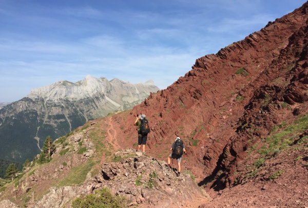L’ambiance est donnée dès le départ avec un tipi au pied de cette belle montagne, le Castillo d’Acher, une curiosité géologique au milieu des Pyrénées espagnoles. Le bas de la montagne est très verdoyant ; ensuite il y a un important contraste entre les belles pelouses vertes et la roche rouge qui recouvre les flancs, le tout surplombé par un sommet avec de belles falaises blanches. Avec très peu d’imagination, on a passé la journée à la fois sur la planète Mars et dans un paysage de western - il manquait juste les cow-boys et les Indiens, mais on a vu leurs chevaux (on n’a pas eu droit à l'attaque de la diligence...). Pour finalement arriver au refuge de Gabardito (1380 m) où on gardera en mémoire un fabuleux plat de pâtes en entrée qui assurément nous donnera l’énergie nécessaire pour l’étape suivante...