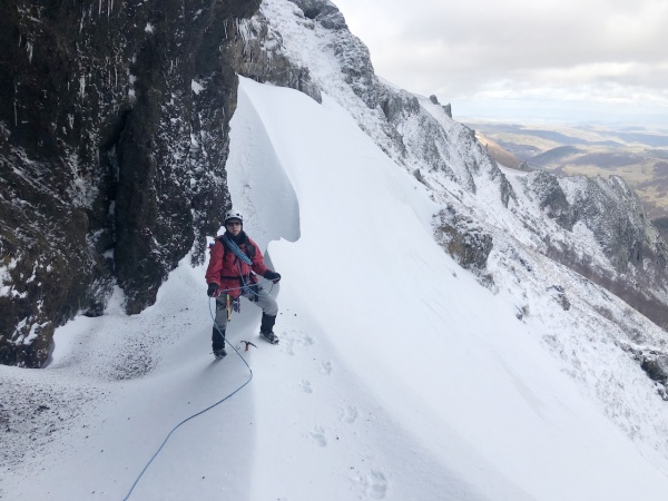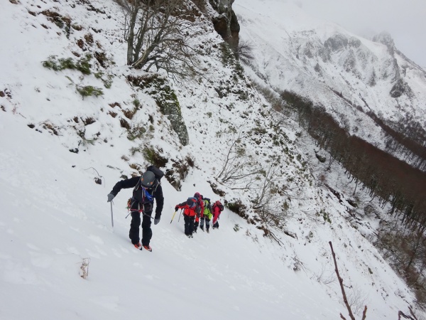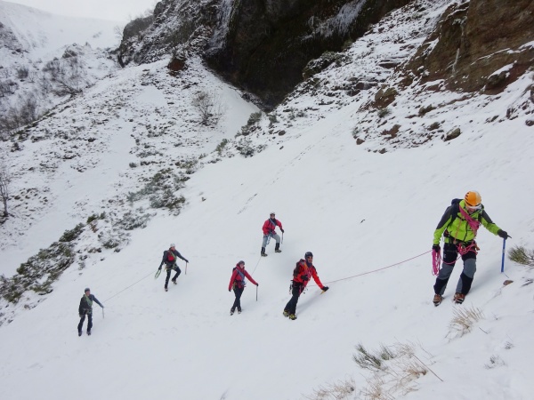 Après quelques passages dans le bois, nous sommes vite dans les couloirs escarpés et glissants de vallons sans noms. Ces couloirs raides sont idéaux pour les exercices de cramponnage et autres pratiques alpi. Nous avons donc pu cramponner dans des conditions très variées : pentes enneigées, flancs glacés, touffes d’herbes gelées. Nous cramponnons et grimpons, traversons et descendons en progressant dans une variété de terrains, de conditions et de difficultés.