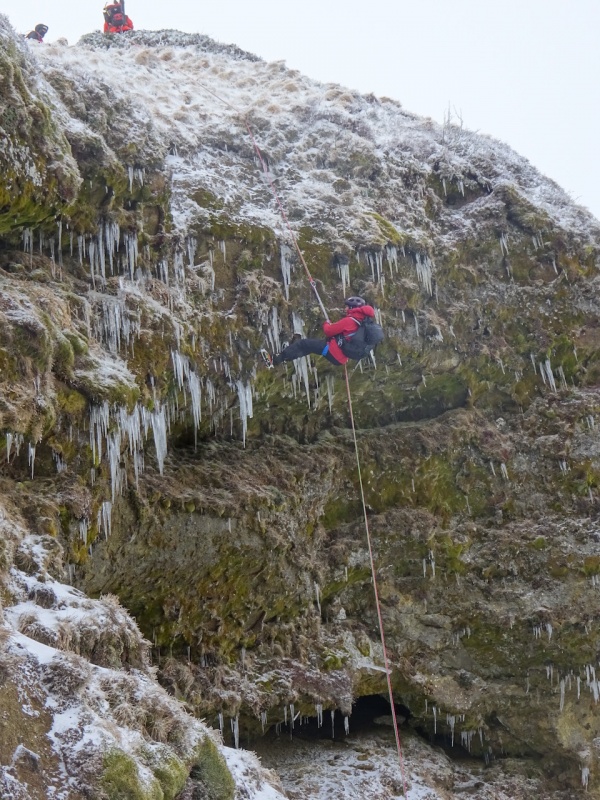 Pour ce perfectionnement, nous nous approchons de l’aiguille du Moine et faisons une belle traversée sous les barres rocheuses du Dôme qui nous protègent du vent. De nombreux exercices sont aussi révisés : corps mort avec piolet, avec ancre à neige, arrêts de chutes, installation de relais, main courante, recherche de DVA. D’un bon pas, nous grimpons à la Croix-Michel, d’où nous descendons en rappel. C’est une belle descente avec crampons sur les stalactites de glace, puis dans le vide en partie inférieure de ce grand roc.