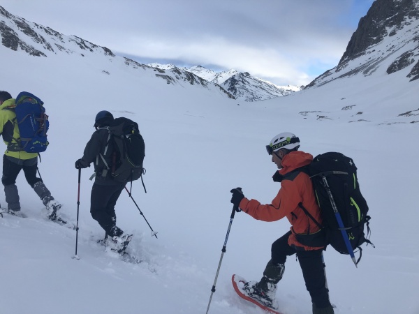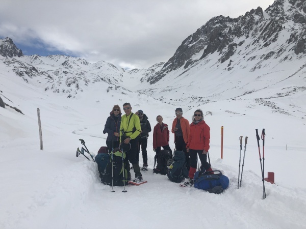 Ce premier jour nous offre déjà toute la beauté d’une montagne grandiose, la joie de traverser un col (col de Rochilles, 2496 m), l’harmonie d’un groupe dont les rythmes des uns et des autres s’ajustent petit à petit, le silence des lacs endormis sous la neige, le crissement des raquettes mordant la neige fraîche, les rayons du soleil encourageants.