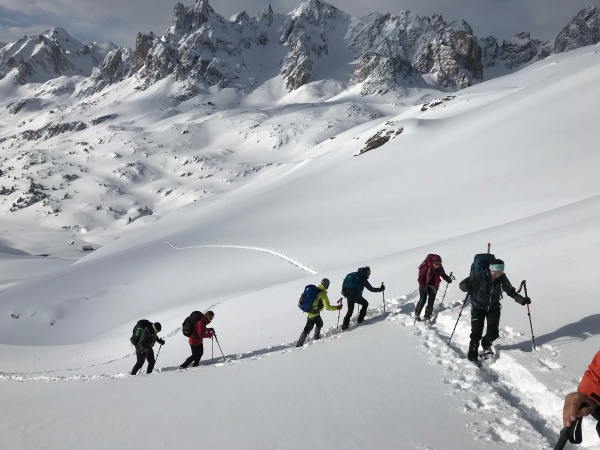 C’est une sortie raquettes sur quatre jours (du 28 février au 2 mars), en étoile, basée au refuge des Drayères dans le massif du Thabor/Cerces, que nous avons le bonheur de vivre. Le refuge nous abrite tout au fond de la vallée de la Clarée. Nous sommes entourés par des sommets grandioses : Pointe des Cerces, Aiguille Noire, Roche Château, Rocher de la Grande Tempête.