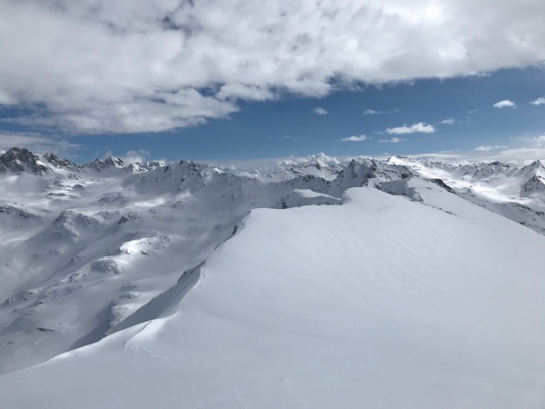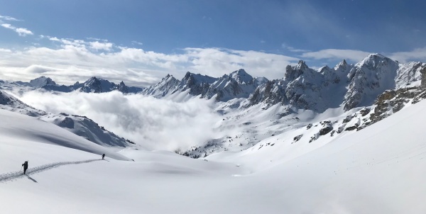 Le troisième jour, dimanche 1er mars, fut certainement l’apogée de cette sortie. Au bout de quelques centaines de pas, nous nous trouvons dans une royale blancheur immaculée, aucune trace, le rêve du randonneur. Tout autour, ce sont beauté et silence, des sommets rocheux aux parois blanches se découpant sur le ciel bleu. Quelques petits nuages, grande blancheur et pureté des vallons et couloirs, magie et mystère du calme de cette montagne qui nous reçoit sous un soleil radieux. En zigzaguant, nous gravissons le ravin du Lau jusqu’à la Roche Château. À 2880 mètres, le panorama est le meilleur cadeau de cette ascension.