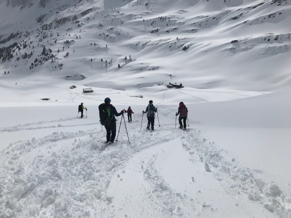 Le plaisir n’en finit pas, car nous descendons dans une douce poudreuse profonde. Fou de joie, chacun fait sa trace et le refuge est là trop vite.