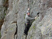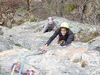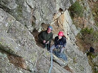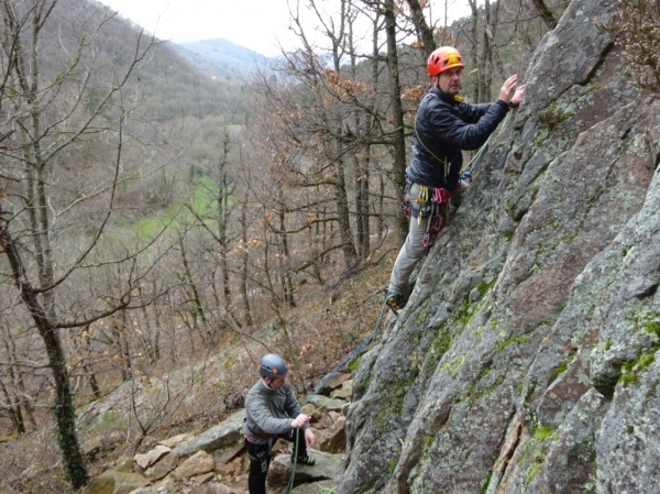 Le samedi 2 avril, retrouvailles amicales et matinales pour covoiturage à 9 h, puis briefing au pied du Rivalet à 9h30. Échanges de douces bises et de poignées de mains velues pour les retardataires. Répartition du poids des cordes entre les différents volontaires, c'est-à-dire tous, mais pas assez de cordes :-) Composition de trois cordées en flèche entre les sages et les insouciants, et c'est parti pour des envolées fantastiques sous un soleil printanier breton aux multiples nuances de gris. Joie, bonne humeur, gaieté et malice ont guidé les singes du célébrissime CAF de Clermont-Auvergne. Reprise des basiques et grimpettes jusqu'à la pause bien méritée de midi, pardon 13h30. Échanges de victuailles, d'impressions, sous l'astre lumineux, et c'est reparti pour une après-midi burlesque où les pieds nickelés furent invités à la fête et où la troupe put constater que Noël tombait aussi en avril, avec l'homme qui tombe à pic.