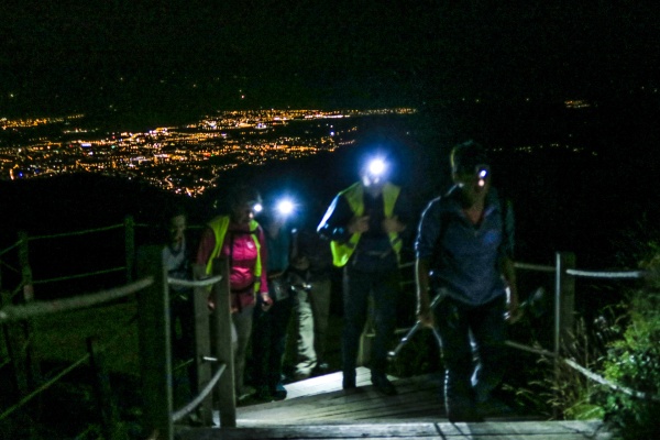 Cela commence fort puisque le rendez-vous au restaurant face à la gare va être suivi d'un excellent dîner, léger et inventif à la fois : juste ce qu'il faut pour ce qui nous attend dans les heures qui suivent. Nous démarrons donc la randonnée vers 22h30 pour traverser la ville éclairée jusqu'à Royat : rue du Port, place de la Victoire, place de Jaude, rue Blatin (il y a foule dans les rues du centre) puis les thermes de Royat (vers 0h)... Après la Belle Meunière, fini l'éclairage public. Gilet fluo et lampe frontale sont sortis du sac et nous nous enfonçons dans la nuit.