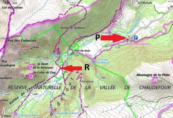 La carte ci-dessous montre comment se rendre du parking de la vallée (point P) au lieu du pique-nique (point R).