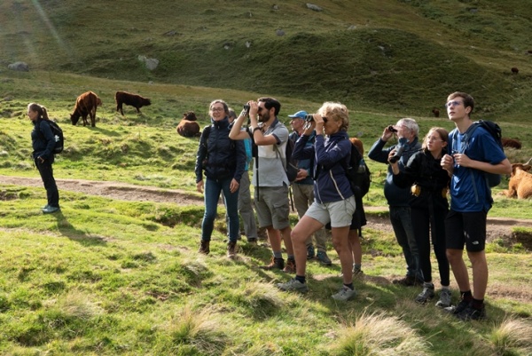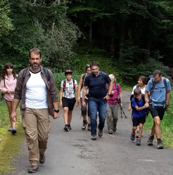 Ce sont 22 adhérents et non-adhérents qui se retrouvent en début d'après-midi au chalet du Sancy. Toutes les générations sont présentes, le CAF d'Issoire est représenté par une famille de quatre personnes. La température est idéale, le ciel est partagé entre soleil et nuages. Patrick Mougel, accompagnateur en montagne, anime la découverte de la faune et Guillaume Lello, responsable de l'activité randonnée montagne, pilote la randonnée. Pour que chacun puisse profiter des deux activités, Guillaume répartit les participants en deux groupes qui permuteront à mi-parcours.