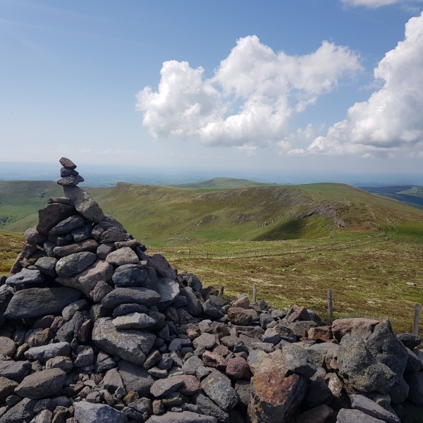 Petit café clafoutis puis ascension du Plomb du Cantal sous un soleil radieux, panorama à 360° sur les sommets alentours : puy Mary, Griou, Peyre-Arse….