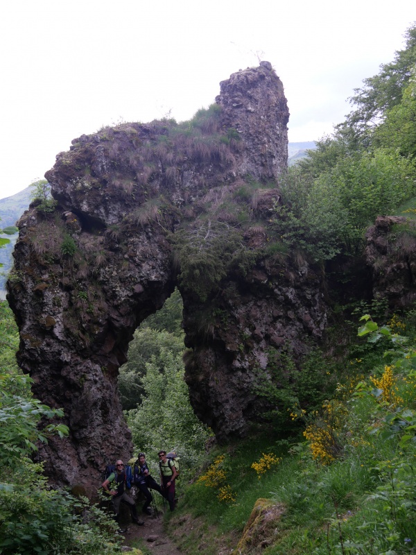 Nous progressons sur une ancienne voie romaine le long de murets en pierres au milieu des fleurs jusqu’au buron de Tuilière, puis nous entamons la descente dans la vallée à travers les bois où nous découvrons le chaos impressionnant de Castelinet et sa porte du Lion.
