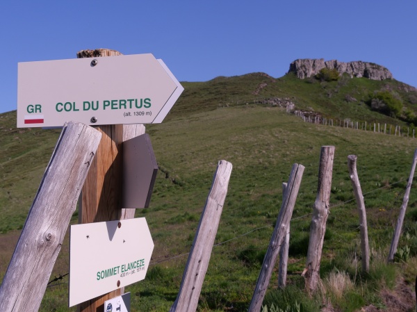 Nous suivons le GR 400 jusqu’au col de Chèvre entre les puys de Brunet et de la Cède.