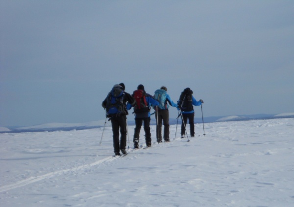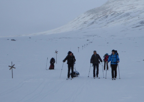 Mardi 22 mars, le ciel radieux, et les -20°C n'entament en rien la joie du groupe quand il monte dans le car pour rejoindre la première étape le conduisant dans la vallée du Sarek. Nous finissons le chemin en ski-doo, qui fera deux voyages pour emmener les passagers à Saltoluokta. L'après-midi, nous chaussons les skis pour une balade de mise en forme. Le plateau nous laisse découvrir la grande vallée des lacs gelés en enfilade jusqu'à Ritsem, vue magnifique du sommet du Danak. La descente s'avère difficile, la neige est gelée et certains déchaussent pour éviter de prendre des risques. Au retour, une bonne dose de bière, 50 cl, un repas copieux servi à la suédoise, avec plateau de fromages, café raisins, confiture, réjouissent pleinement les Auvergnats que nous sommes...