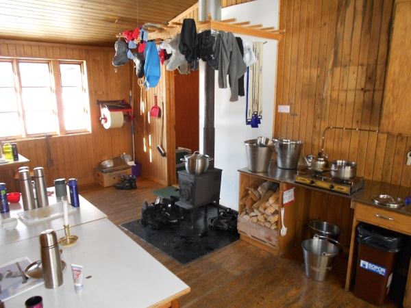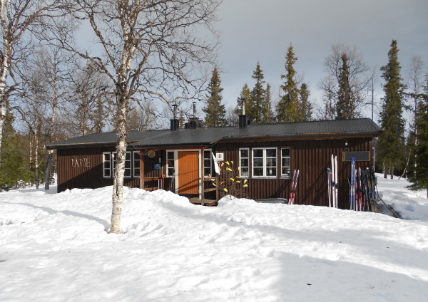 Lundi 28 mars : grasse matinée, c'est le soleil qui nous sort du lit à 8 h. Il a bien gelé et les toilettes sont inaccessibles sans bâtons ! La pluie de la nuit et le gel du matin ont glacé le sol. Nous aviserons pour une sortie après le déjeuner. Les cabanes de Parté sont au bord du lac gelé dans un site majestueux dominé par les monts du Sarek. Nous n'oublierons pas le moment où les traîneaux s'élanceront sur le lac, montrant la puissance et la joie des chiens. Nous convions le gardien à déguster nos produits du terroir : il apprécie le jambon, saucisson, fromage d'Auvergne en s'étonnant de leur arrivée jusqu'à lui. L'arrivée de deux soeurs jumelles, souriantes et athlétiques, vient « émoustiller » la gent masculine ! Elles s'installent avec nous le temps d'avaler leur repas et repartent aussi vite, faire notre étape de la veille qu'elles boucleront en 4 h au lieu de 9 h, dixit le gardien qui aura eu des nouvelles du refuge d'arrivée. Sans carte, la pêche blanche est interdite, : dommage, cela nous aurait tentés. Le gardien essaie quelques prises mais revient bredouille : sympa, il nous apporte pour le goûter un cake à la carotte que nous apprécions tous. Pour le remercier, nous le convions le soir pour partager la poire de Paul, la verveine de Stéphane et quelques mots de français, moments bien agréables autour du poêle à la lueur des bougies.