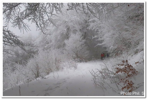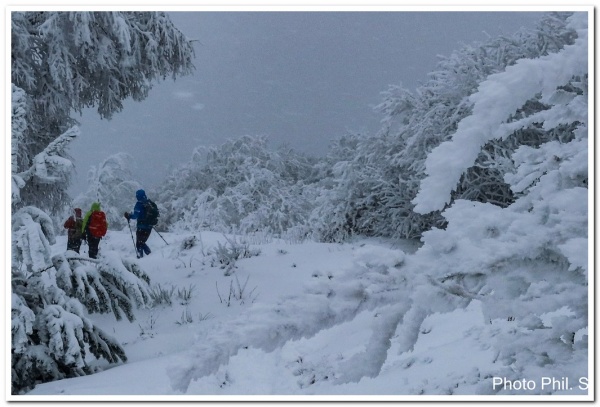 Les autres montent sagement alignés, il n'y a pas grand chose à voir. Ciel gris, flocons, arbres pleins de neige, 20 cm de fraiche au sol. Sommet de Louchadière vers 11h.