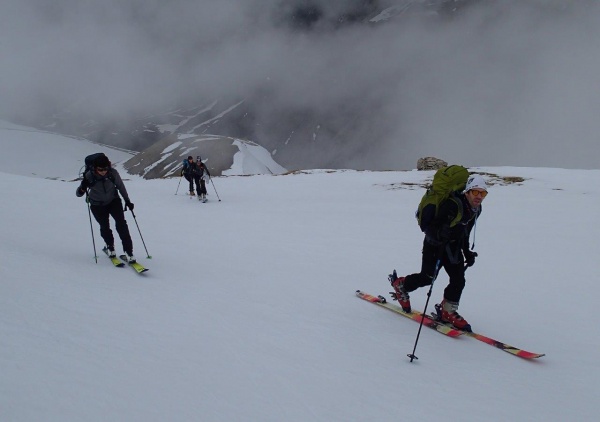 Après les checks DVA de rigueur, nous partons en direction du col Pers. Après 150 m de dénivelé et quelques conversions, le groupe se sépare en deux selon le rythme souhaité. Les premiers iront jusqu'au col Pers, les deuxièmes s'arrêteront un peu avant, mais tous se retrouveront dans la purée de pois. La descente connaîtra son lot de péripéties : brouillard entraînant quelques erreurs d'itinéraire, une belle chute dans un couloir pour Marc (plus de peur que de mal heureusement), un aller-retour dans les Vallons de Malpasset pour Fabien, ce qui le fera marcher plus que prévu et beaucoup de joie pour tout le monde à refaire des virages. De retour plus tôt que prévu pour cause de mauvais temps, nous passons l'après-midi entre balades, jacuzzi en extérieur (extrême bonheur pour Albert, Claire, Didier et Fabien), lecture, préparation du dîner et de la course du lendemain.