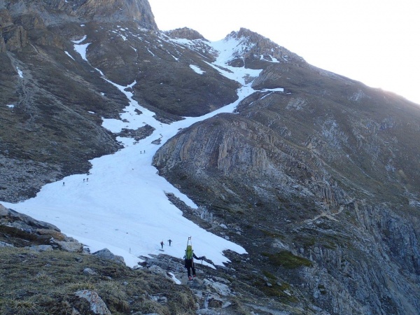 - deuxième groupe : la longue rampe à 35°, qu’on rencontre sans préliminaire, nous offre un réveil musculaire... un tantinet abrupt. Sauf pour Fabrice qui doit être réveillé depuis longtemps, si on en juge par sa vitesse de bouquetin en cavale ! La suite est plus douce, quoique plus longue. En haut, les nuages annoncés pour onze heures semblent avoir pris du retard. Ça tombe bien pour Claire, qui ayant encore un peu faim, propose aux amateurs de remonter au col de Rhêmes-Calabre comme dessert, pendant que d’autres les attendent sur un rocher, torse-poil au soleil – ambiance printemps.