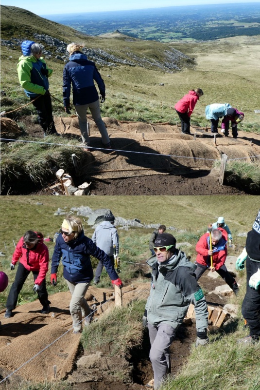 Le dimanche 15 septembre, nous sommes douze adhérents, parents ou amis d'adhérents, du CAF Clermont-Auvergne, à nous rassembler sur le parking relais Margeride. Nous allons prêter main-forte à Guillaume Trapenat, garde nature à la Réserve naturelle nationale de Chastreix-Sancy pour rénover le GR 4 sur la crête du val de Courre. Le chemin a été mis à mal au printemps par la fonte brutale de la neige et l'afflux des randonneurs.