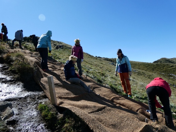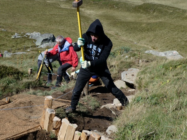 Le vent s'est calmé. Nous créons des barrages de pieux en travers du chemin raviné, nous posons de la toile coco sur les zones piétinées et nous fixons celle-ci au sol à l'aide de corde et de petits pieux. Masses et massettes sont à l'œuvre, nous faisons travailler tous nos muscles aujourd'hui ! La nature terminera le travail : les sédiments se déposeront contre les barrages lors des prochaines pluies, les plantes pousseront au travers de la toile coco au printemps.