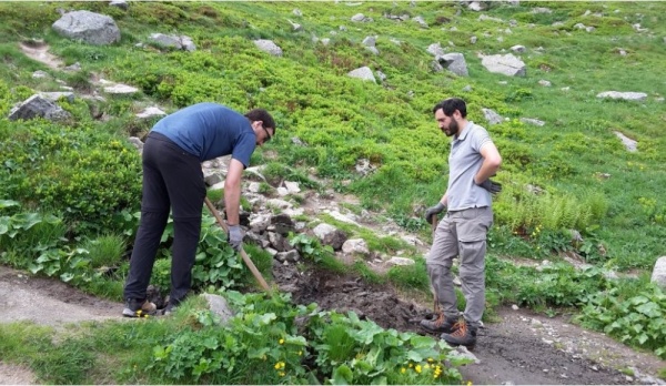 Bernard, Eric, Frédérick, Guillaume, Loïc et moi nous retrouvons sur le parking du téléphérique le dimanche 22 mai, à 9h30. Guillaume Trapenat, notre partenaire de la Réserve de Chastreix-Sancy, nous accueille. Le soleil est radieux. Une petite randonnée nous emmène à pied d'œuvre. Armés de pelles et de pioches, nous égalisons le terrain raviné. Nous entretenons ou créons des renvois d'eau, canaux obliques qui rejettent l'eau de ruissellement hors du chemin. Nous plaçons des pierres en travers de traces secondaires pour en décourager l'accès.