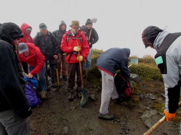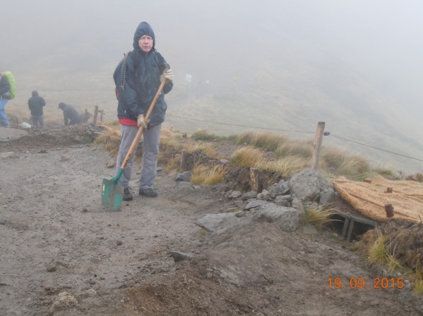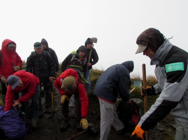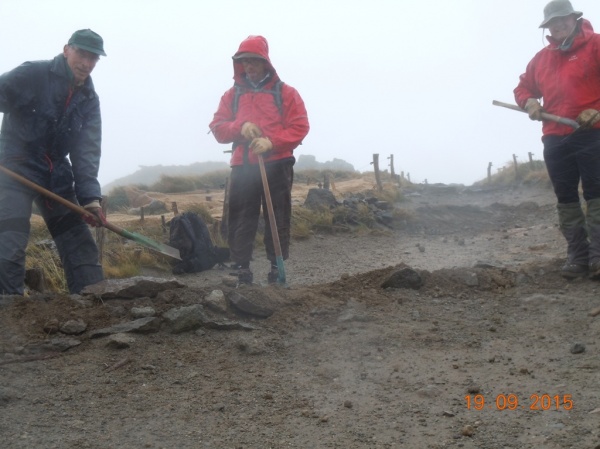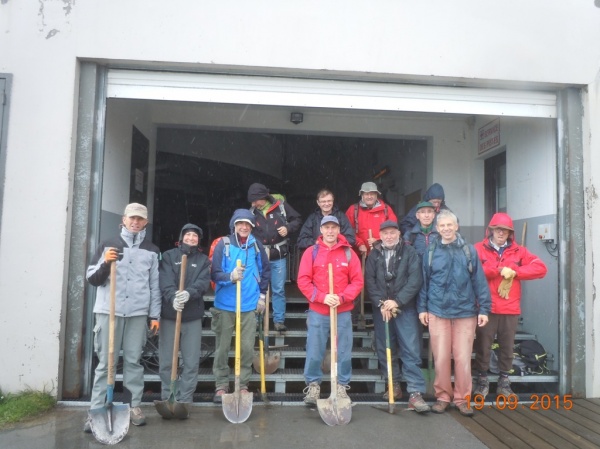 Malmenés par les précipations et les passages des nombreux touristes, construits sur des sols érodables, les sentiers de crête du Sancy ont besoin de nous ! En partenariat avec la Réserve naturelle nationale de Chastreix-Sancy, nous avons bâti notre action 2015 sur les sentiers menant aux sommets des puys Ferrand et de la Perdrix. La météo aura été capricieuse jusqu'au bout ! Ce samedi 19 septembre, nous passons du soleil à Saint-Diéry à la bruine à Super-Besse. Celle-ci nous accompagnera toute la matinée. Heureusement, notre équipe, forte de neuf participants est motivée. Plusieurs d'entre nous ont déjà participé à des opérations de restauration et/ou d'entretien de sentier. Pascal Saint Jean apporte la première participation de Chamina Voyages à notre événement.